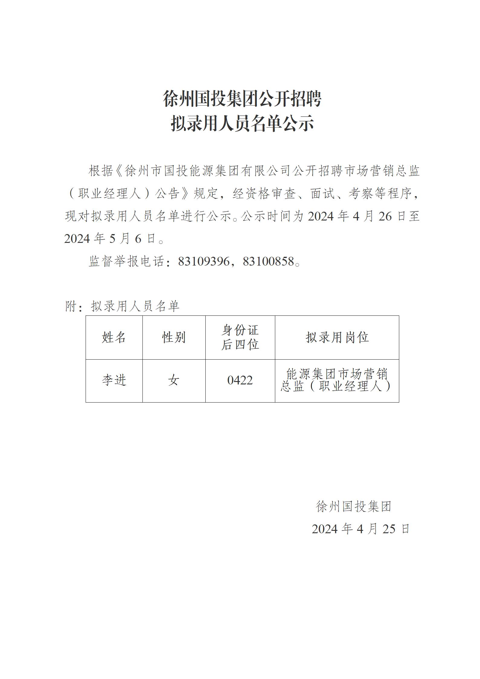 徐州國(guó)投集團(tuán)公開(kāi)招聘擬錄用人員名單公示