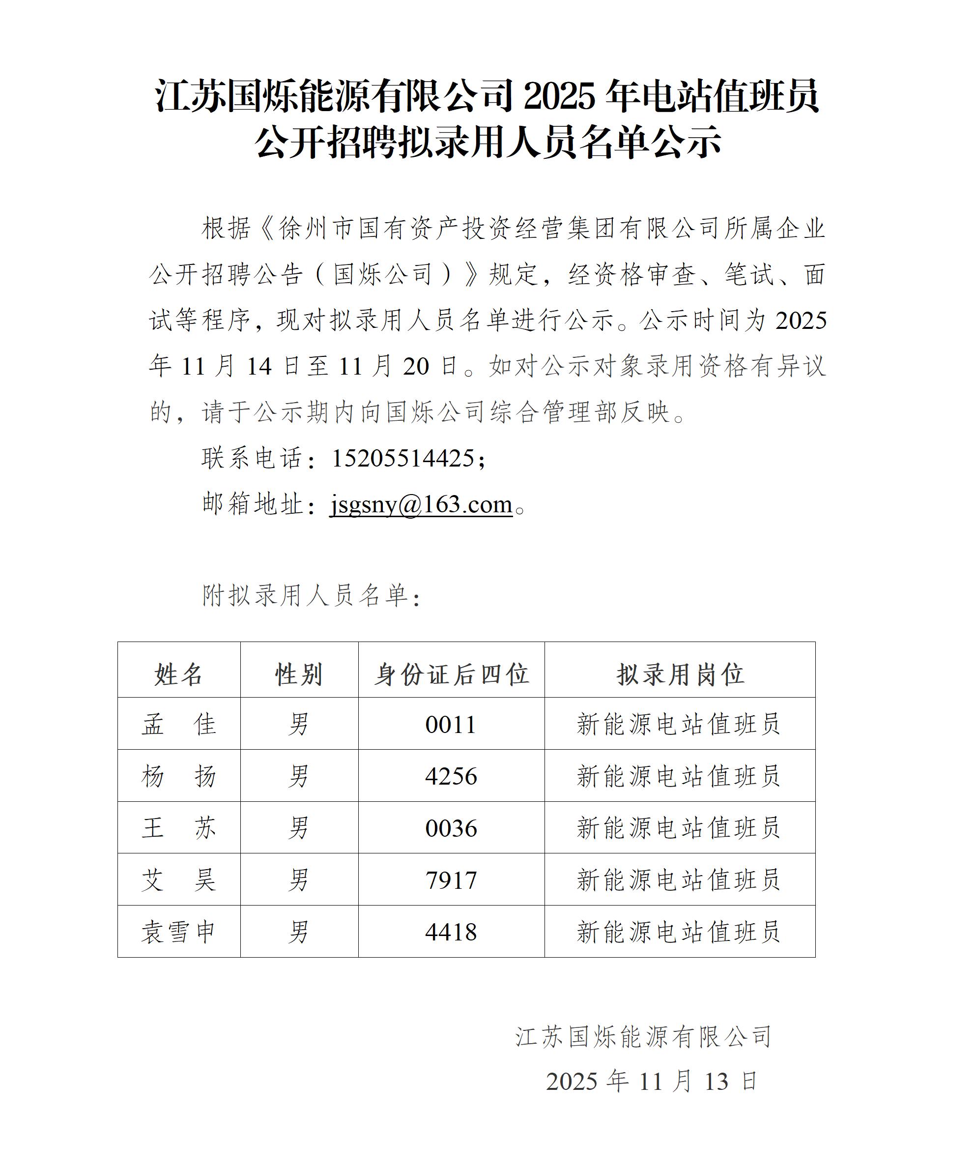 江蘇國(guó)爍能源有限公司2025年電站值班員公開招聘擬錄用人員名單公示