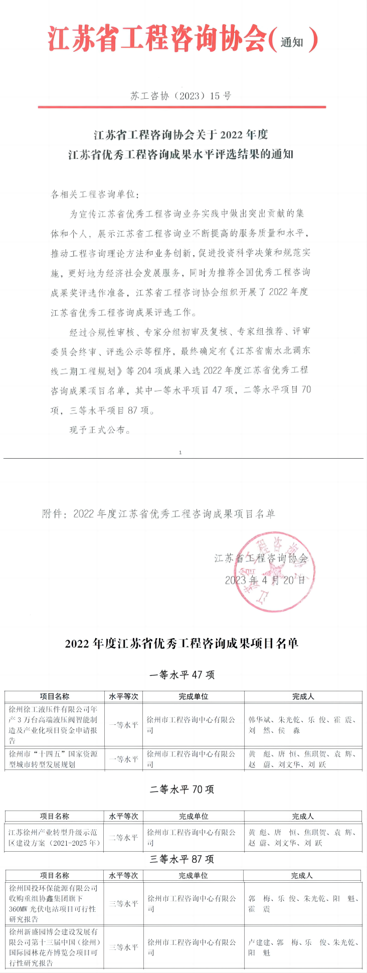 為展示江蘇省工程咨詢業(yè)服務質(zhì)量和水平,宣傳表彰在江蘇省優(yōu)秀工程咨詢業(yè)務實踐中做出突出貢獻的集體和個人,近日,江蘇省工程咨詢協(xié)會組織開展了2022年度江蘇省優(yōu)秀工程咨詢成果水平評選工作。集團公司所屬工程咨詢中心共有5項咨詢成果獲獎,其中一等水平2項,二等水平1項,三等水平2項。