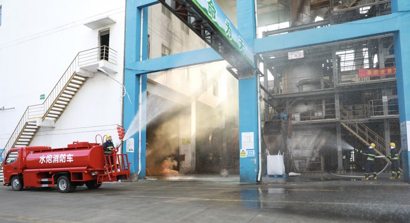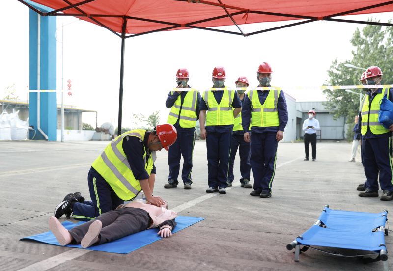本次應急演練活動現(xiàn)場位于危廢處置中心危險廢物焚燒車間,模擬場景設計為巡檢人員在更換窯頭噸桶廢液時,由于操作不當,回流管從收集桶中甩出至地面,廢液飛濺到巡檢人員額面部,造成灼傷。同時,廢液濺至回轉窯周邊遇熱燃燒,并點燃回流管不斷涌出的廢液。事故發(fā)生后,危廢中心應急救援隊伍各司其職,消防與搶險救災組使用滅火器、消火栓、消防水炮霧化滅火;警戒保衛(wèi)組對事故現(xiàn)場警戒;醫(yī)療救護組對受傷人員進行心肺復蘇急救,將受傷員工外送就醫(yī);環(huán)境保護組打開應急水池閘門,做好消防水及洗消水的收集工作。通過各現(xiàn)場應急救援組織機構協(xié)同努力,緊急情況得以解除,現(xiàn)場經(jīng)洗消檢驗后恢復正常狀態(tài)。