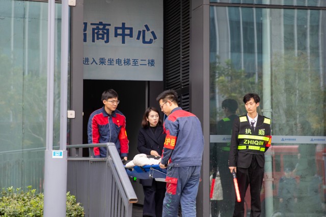 15:30,演練正式啟動。消控室值班人員發(fā)現(xiàn)消防主機報警后,立即查看著火點信息,迅速通知巡邏崗前往核實。巡邏崗抵達513室后,發(fā)現(xiàn)現(xiàn)場濃煙冒出且有被困人員,立即向中控室報告。通訊聯(lián)絡(luò)組隨即啟動應(yīng)急程序,將消防主機切換為自動狀態(tài),并向總指揮匯報火情。總指揮果斷下達指令,各專項小組迅速響應(yīng),按照預(yù)案展開行動。隨著滅火行動組成功撲滅全部明火,各小組依次向總指揮匯報任務(wù)完成情況,滅火救援綜合實戰(zhàn)演練部分圓滿結(jié)束。