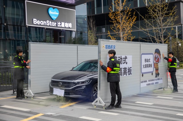 隨后,開始進行新能源汽車自燃應(yīng)急處置演練,演練使用了招商積余物業(yè)針對新能源汽車自燃的專業(yè)滅火裝置,可以快速有效處置新能源汽車底部自燃情況。