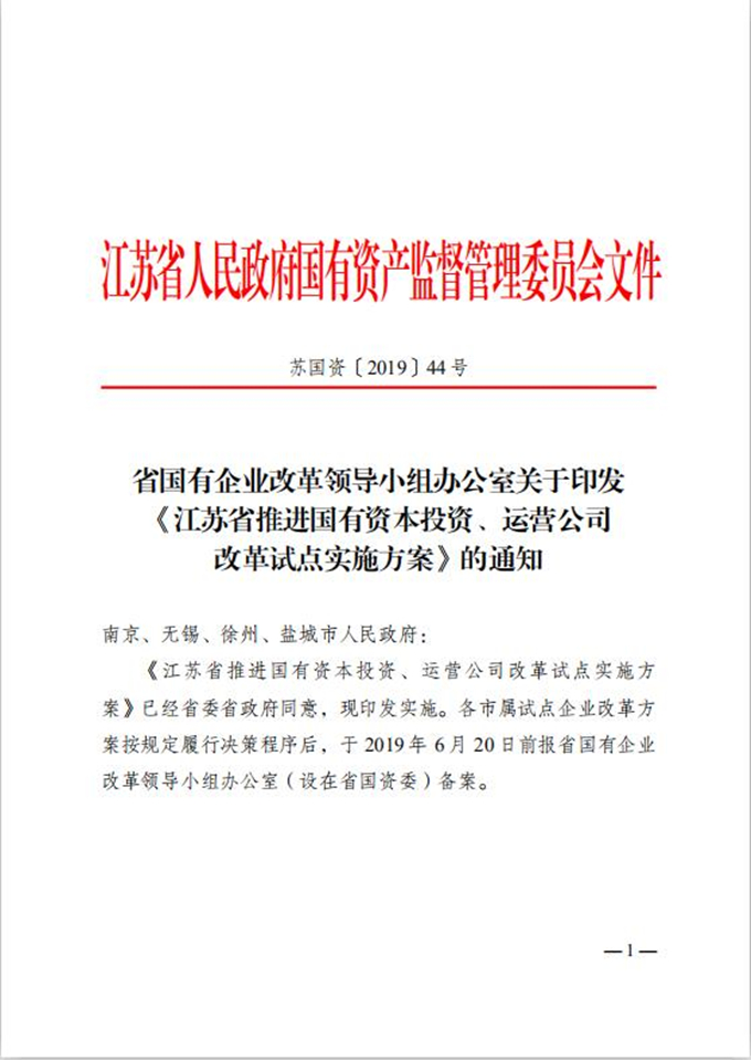 5.4月25日,省國有企業(yè)改革領(lǐng)導(dǎo)小組辦公室印發(fā)《江蘇省推進國有資本投資、運營公司改革試點實施方案》,徐州國投集團被確定為江蘇省首批國有資本投資公司試點企業(yè)。